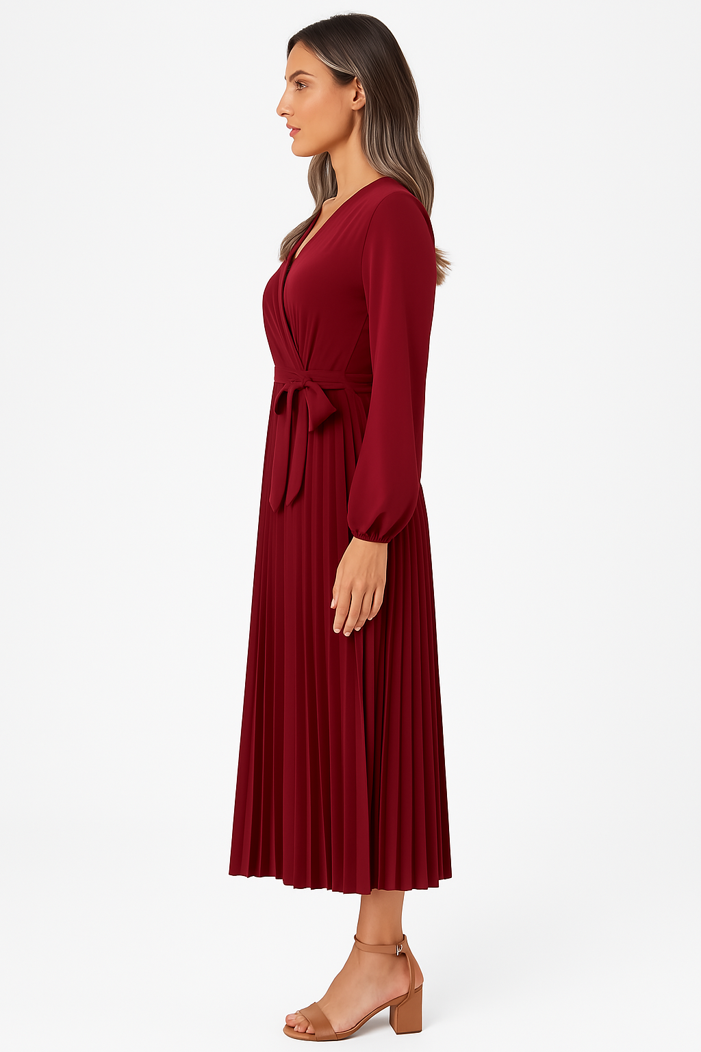 Carmen joue la carte du romantisme profond. Sa couleur bordeaux intense, sa coupe portefeuille et ses manches bouffantes lui donnent un charme classique irrésistible. Le plissé apporte du mouvement, et la ceinture nouée souligne la taille. Élégance assurée.